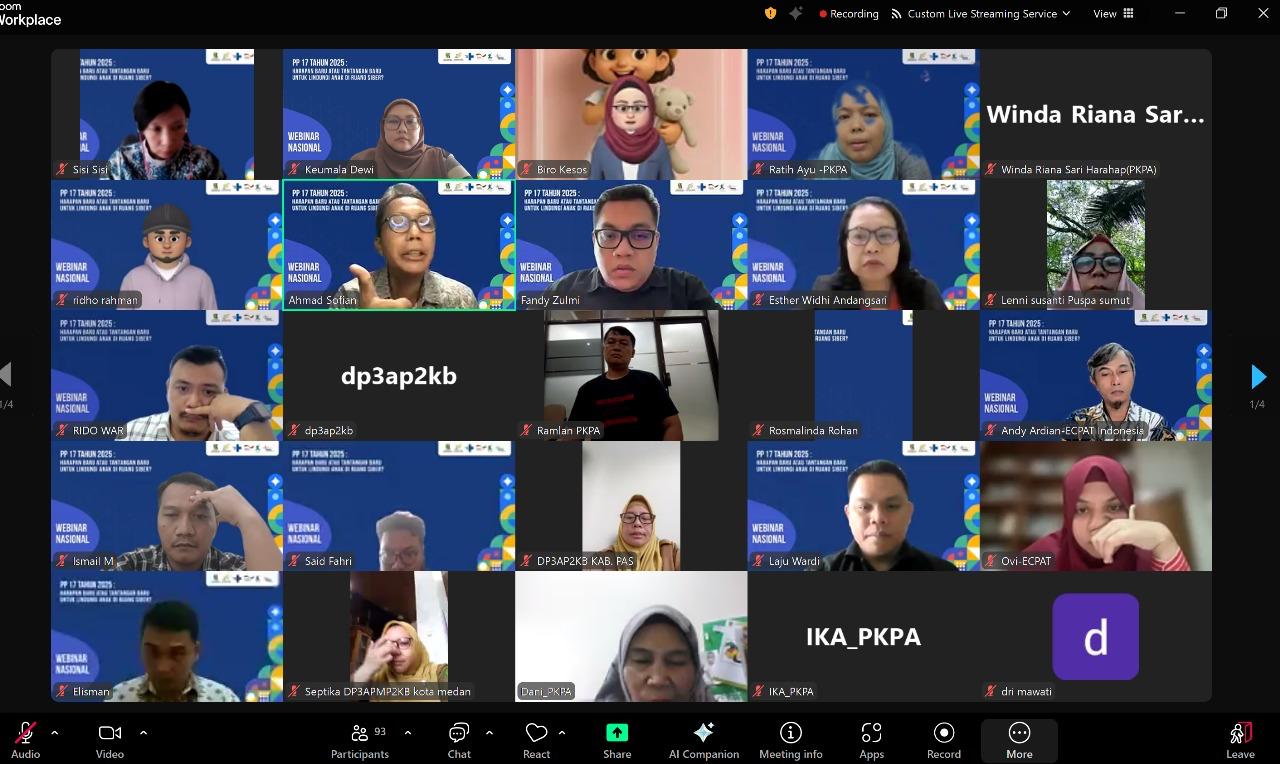 Sebagai respons terhadap lahirnya regulasi ini, Pusat Kajian dan Perlindungan Anak (PKPA) bersama ECPAT Indonesia dan Departemen Hukum Bisnis Universitas Bina Nusantara menyelenggarakan Webinar Nasional bertema “PP 17 Tahun 2025: Harapan Baru atau Tantangan Baru untuk Lindungi Anak di Ruang Siber?”. Kegiatan ini dilaksanakan secara daring melalui platform Zoom pada 21 April 2025 dan menjadi ruang dialog strategis antara pemerintah, akademisi, praktisi hukum, psikolog, hingga organisasi masyarakat sipil. Tujuannya adalah mengkaji lebih dalam substansi, tantangan implementasi, serta potensi kolaborasi dalam pelaksanaan PP ini.