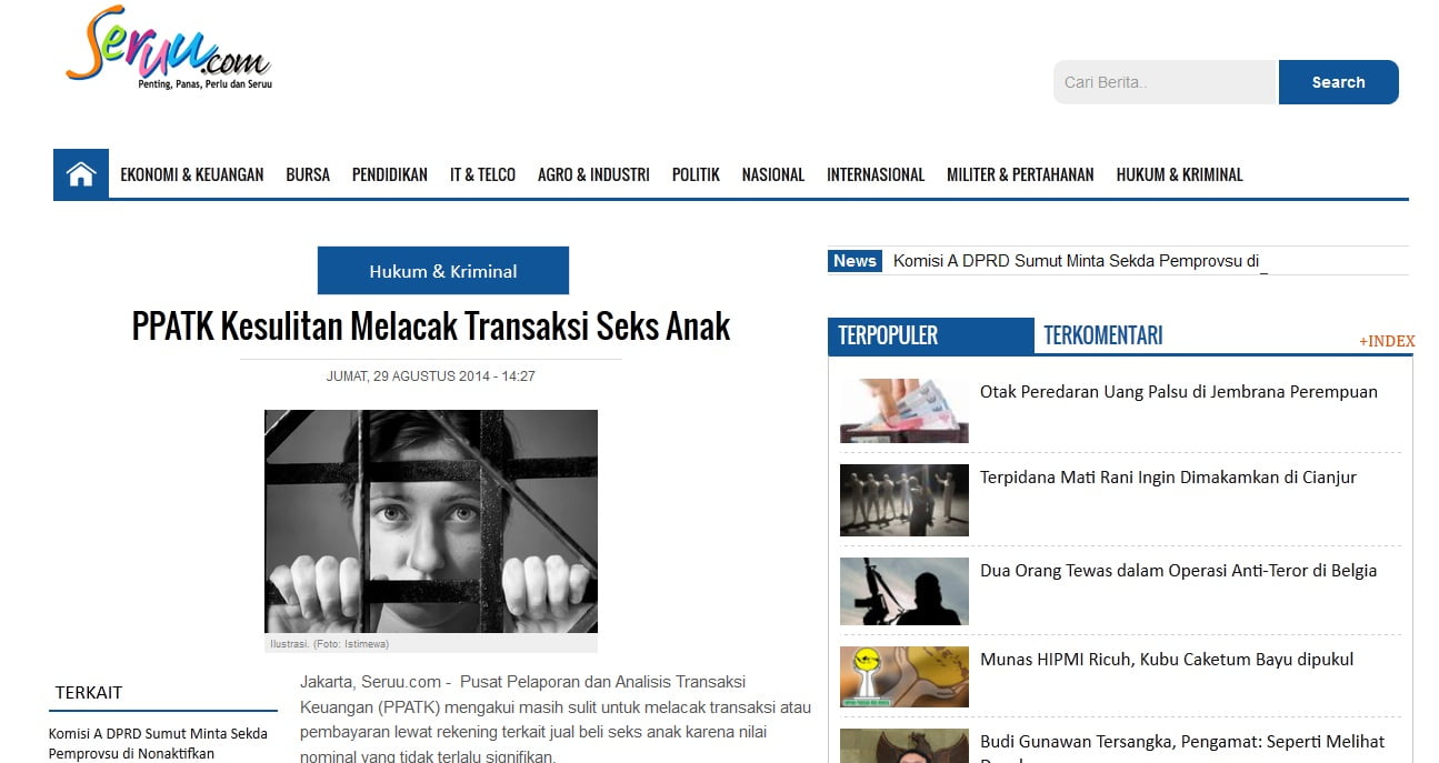 PPATK Kesulitan Melacak Transaksi Seks Anak 19 Jan 2015 http://utama.seruu.com/read/2014/08/29/226241/ppatk-kesulitan-melacak-transaksi-seks-anak