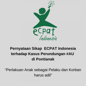 Pernyataan Sikap ECPAT Indonesia terhadap Kasus Perundungan #AU di Pontianak“Perlakuan Anak sebagai Pelaku dan Korban harus adil” 11 Apr 2019 https://www.slideshare.net/ecpatindonesia/pers-release-pernyataan-sikap-ecpat-indonesia-terhadap-kasus-perundungan-di-pontianak